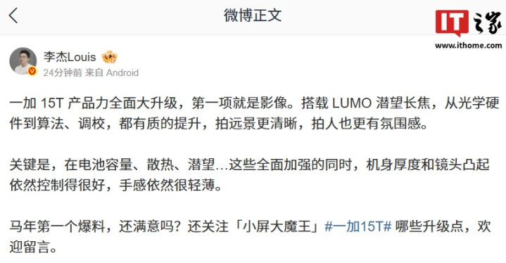IT之家3月2日讯息,一加中国区总裁李杰本日开启了一加15T小屏手机的预热。他示意,这款新机产物力全面升级,影像方面搭载LUMO潜望长焦,声称从光学硬件到算法、调校,齐有质的擢升。