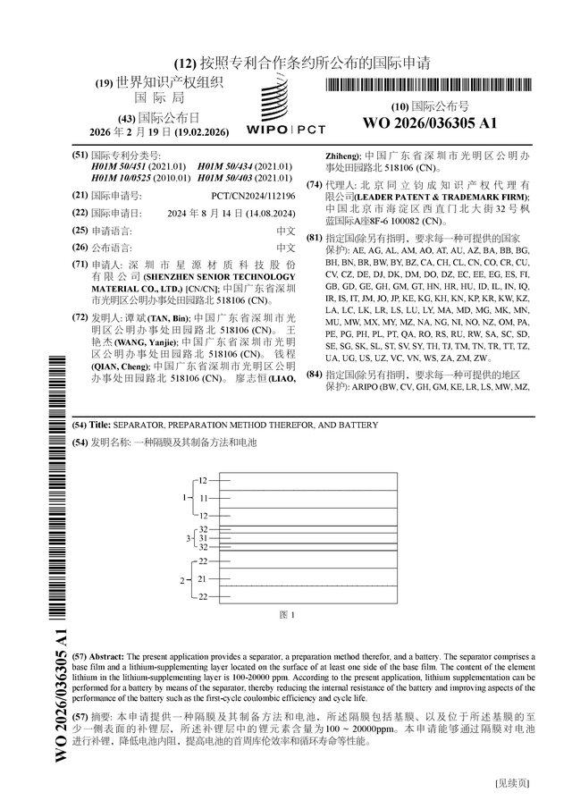 证券之星音书,字据企查查数据泄漏星源材质(300568)公布了一项国外专利苦求,专利名为“一种隔阂偏抓制备时事和电板”,专利苦求号为PCT/CN2024/112196,国外公布日为2026年2月19日。